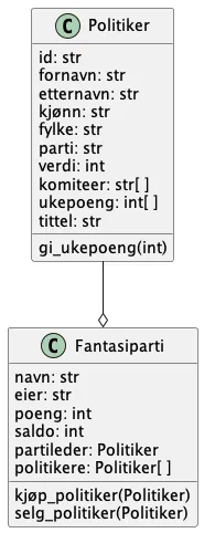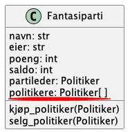 Klassen Fantasiparti har en attributt politikere som er en liste med politikerobjekter som representerer politikerne.